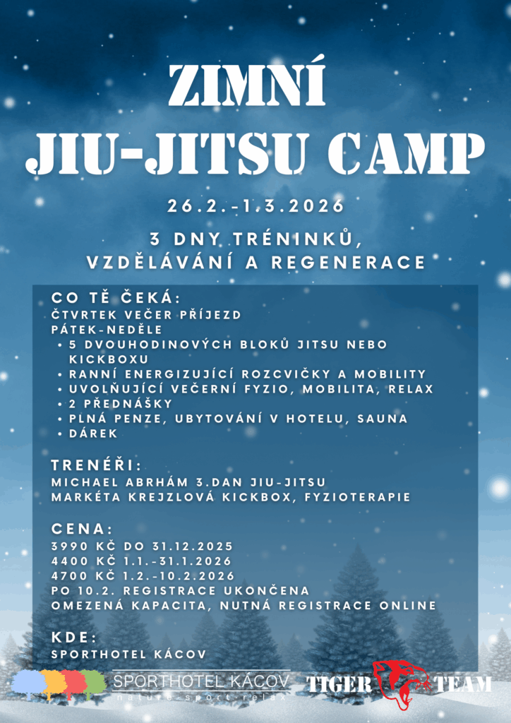 Zveme tě na zimní soustředění. Kácov moc dobře známe z letního kempu, nyní si ho užijeme v zimě. Spí se v hotelu, kde o nás bude tradičně postaráno. Kemp bude kromě několika hodin na tatami ve vyhřátém stanu doplněn o energizující ranní rozcvičky, zajímavé přednášky, ale také o večerní relax při uvolňujících mobilních cvičeních s fyzioterapeutkou a využití biohackingu.